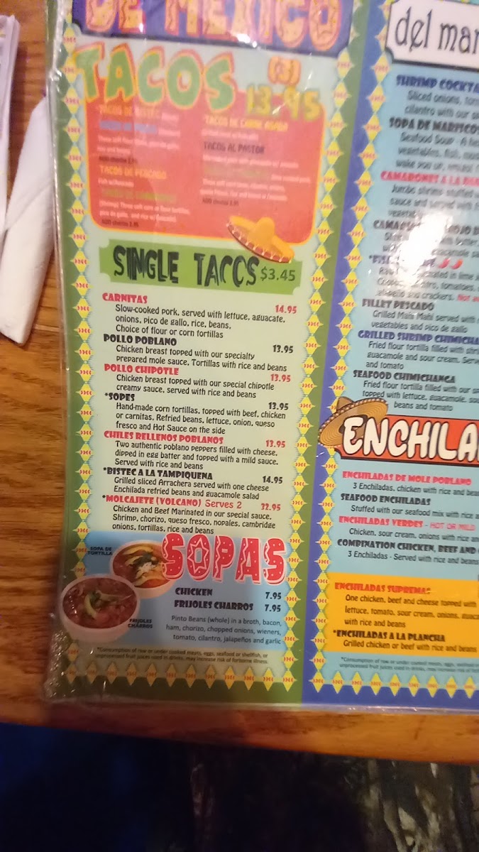 Chicken breast topped with our specialty prepared mole sauce, tortillas with rice and beans.